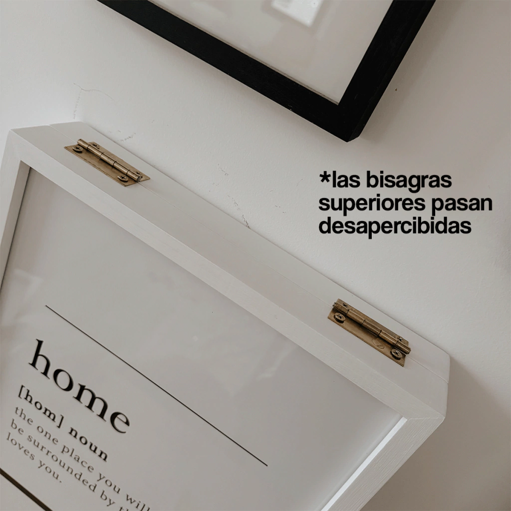 Transformá tu espacio con nuestro cuadro con bisagra, diseñado para ocultar tableros de luz, termostatos o cualquier elemento que no quieras que se vea de hasta 4,5cm de profundidad (si quieres esconder algo de mayor profundidad contactanos por whapp). Este producto es perfecto para quienes buscan funcionalidad y estética en sus paredes.