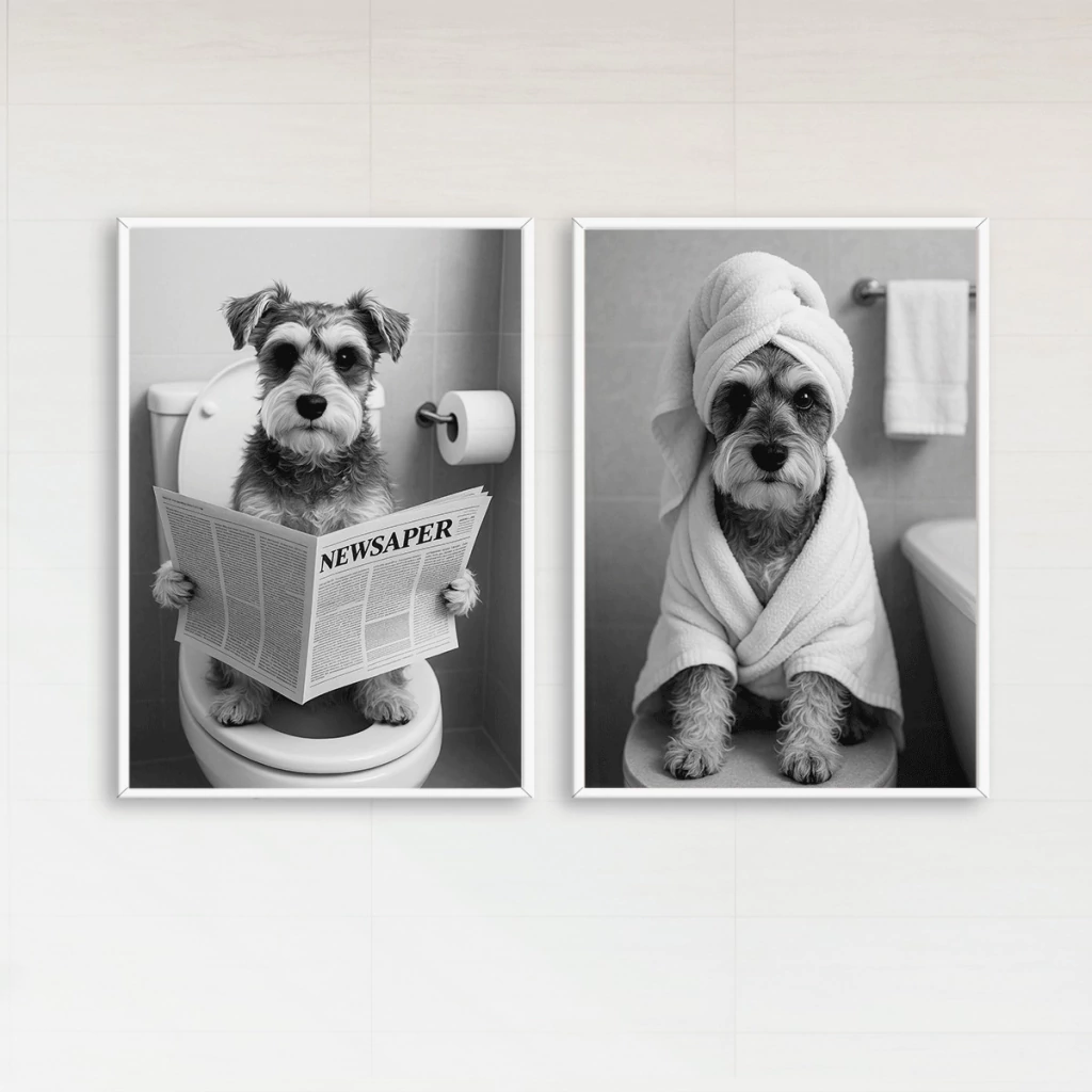¡Dale un toque de humor y estilo único a tu baño o toilette! Hacemos realidad el cuadro viral con la foto de tu perro o gato en el baño. Usamos ChatGPT para crear una imagen original de tu mascota: con un diario en el inodoro y con una toalla sobre su cabeza antes de entrar a la bañera.